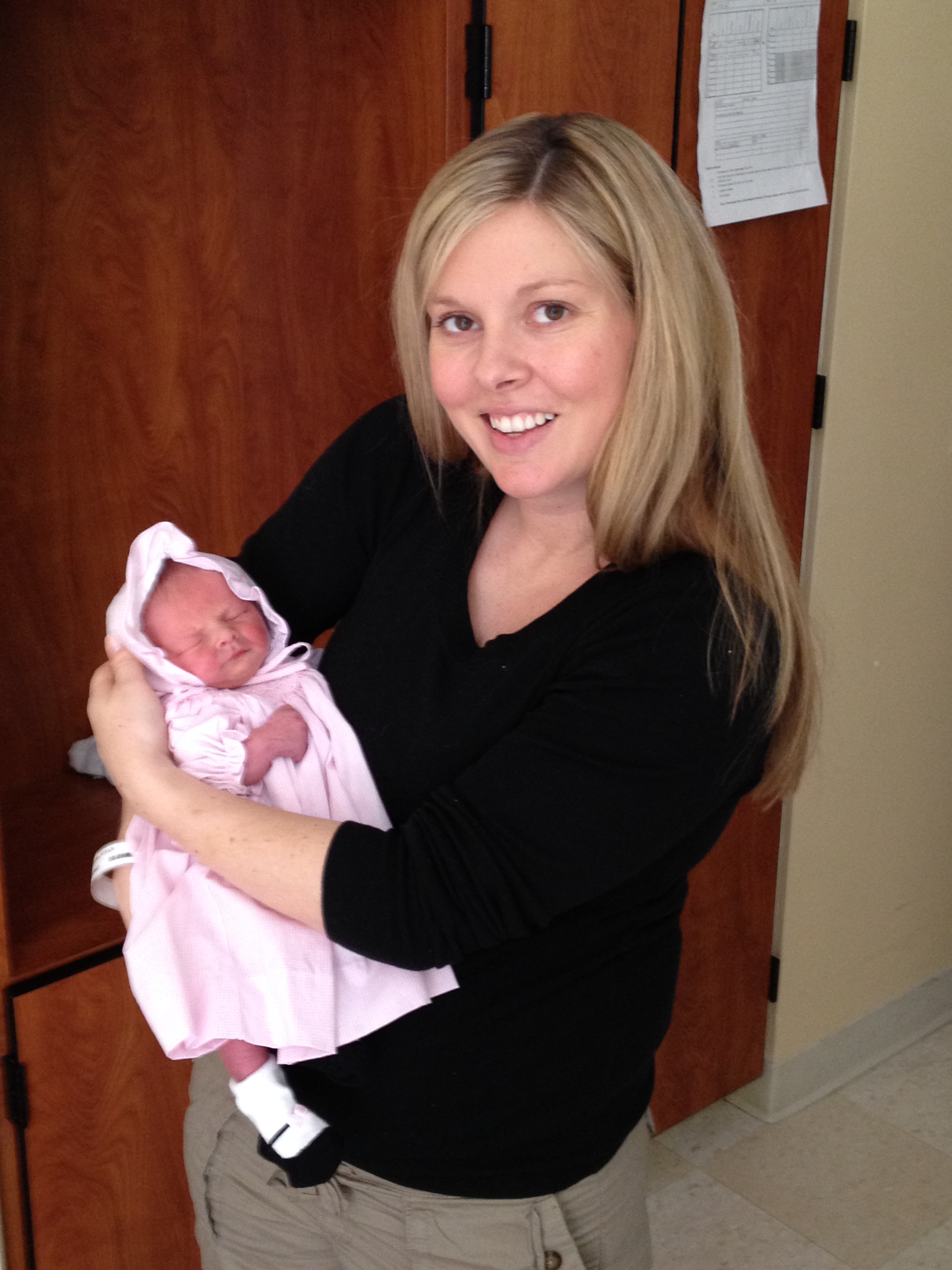 My sweet baby C popped right out after 30 minutes of pushing. Her APGARs were 8 and 9. She was 5 pounds, 5 ounces and 18.5 inches long and she looked perfect.
