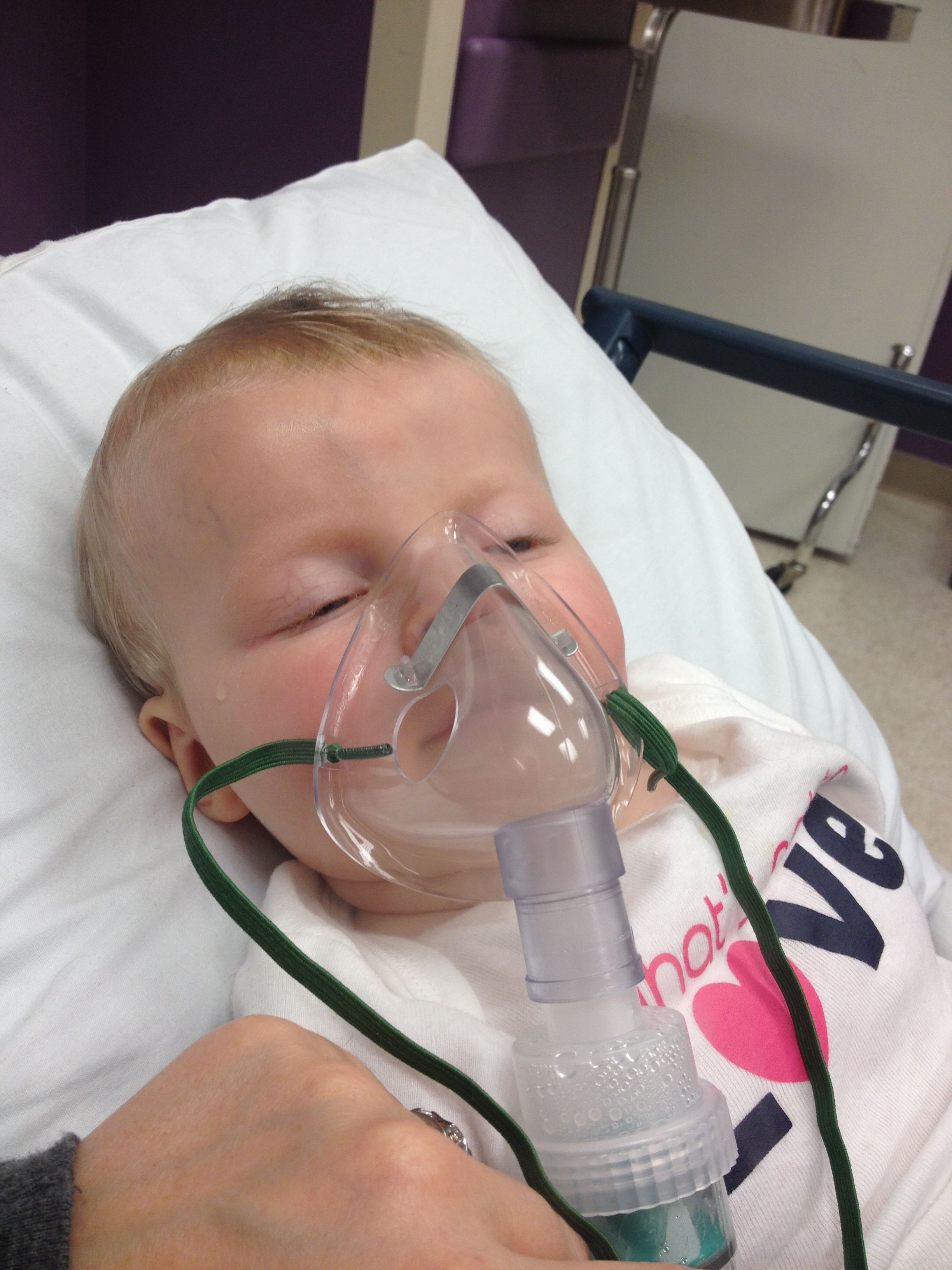 I walked into my sitter’s house and Caroline was in her car seat propping her up getting a breathing treatment. She was working so hard to breathe. Her color was terrible. I lost count on her respiratory rate when it was over 50. I was wigging out. Yes, I know I’m a doctor. But I’m a mom first. So I called her pediatrician on his cell phone (perks of being a doctor) and explained what was happening and that I felt she needed to be seen. He was actually working in the pediatric urgent care portion of the ER at that very minute–which was 4 minutes away from me. He said he would meet me in the waiting room. He did. And he said she needed to go into the ER.